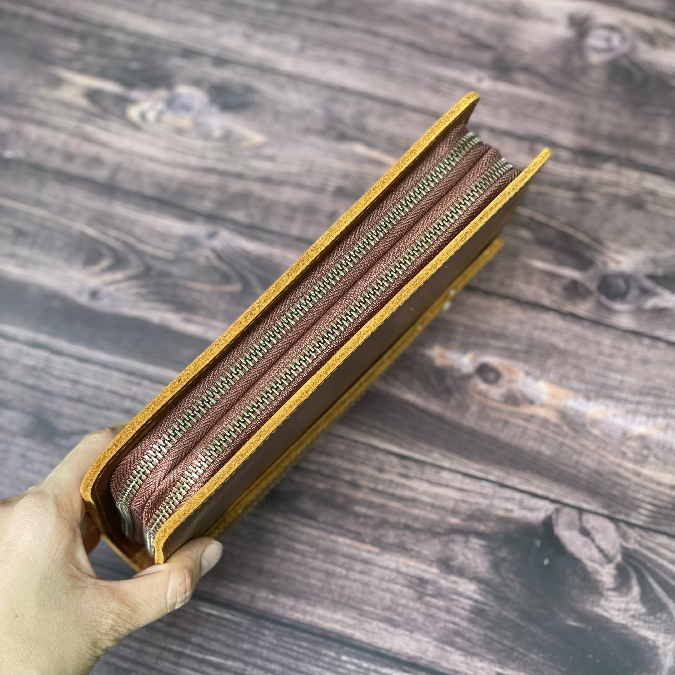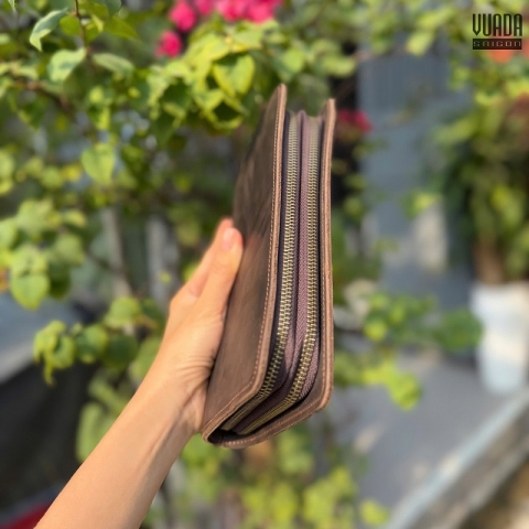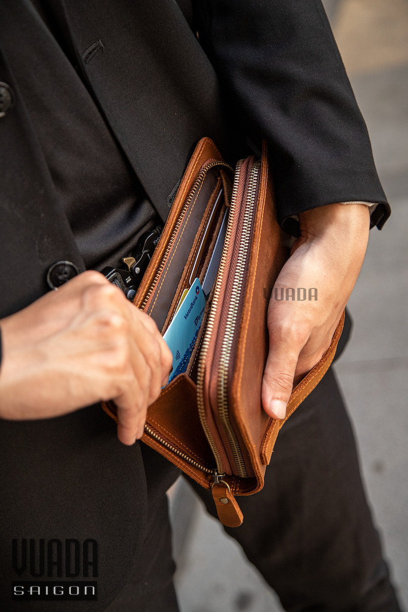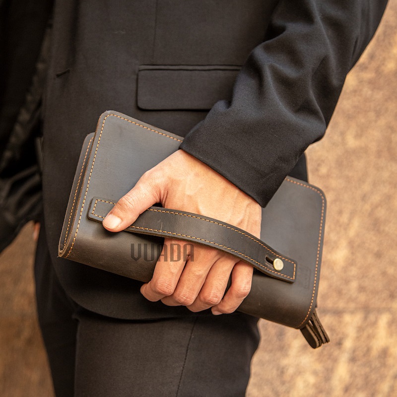Clutch được làm từ da bò sáp cao cấp, da sáp thực chất là da bò được bôi một loại sáp trên bề mặt. Lớp sáp này khiến cho da có những vết xước cực ngầu và cá tính. Sự khác biệt đó còn đến từ độ chai lì, cực kì bền bỉ, chất lừ và sành điệu theo thời gian sử dụng.